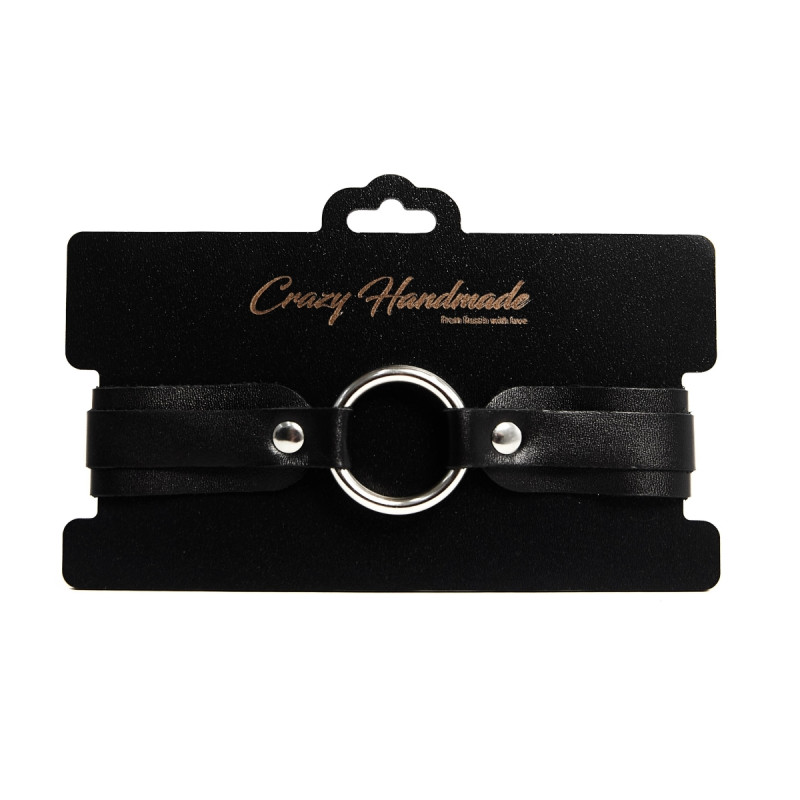 Изготовлен из натуральной кожи с велюровой подкладой. При изготовлении использована никелированная фурнитура. Ширина ошейника 50 мм, длина цепочки (поводка) с карабином 50 см. Размер универсальный. Один из основных атрибутов BDSM.