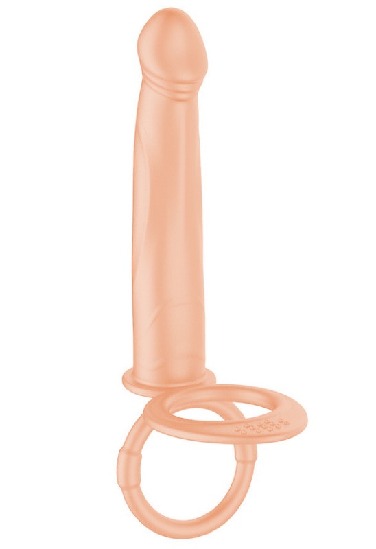 Реалистичная насадка-фаллоимитатор для двойного проникновения. Дополнена эрекционным кольцом с подхватом мошонки.
